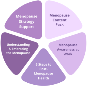 As workplace wellbeing experts, we’re thrilled to offer a range of support to organisations on their journey to becoming menopause-friendly workplaces. Our comprehensive menopause package incorporates five different elements of essential content for your whole organisation.