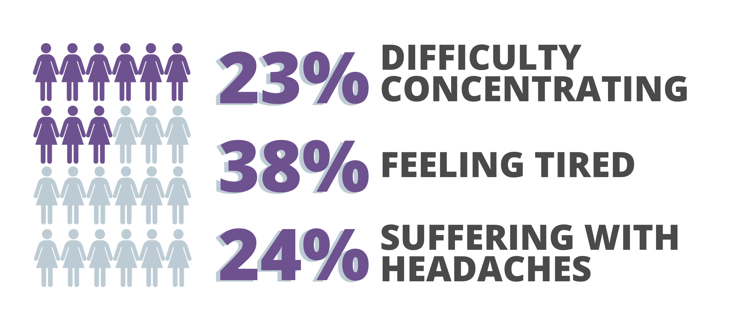 On average, women were experiencing seven different symptoms and 42% said their symptoms were worse or much worse than expected. More than a third of women surveyed said their symptoms had impacted their work life, with 23% sighting difficulty concentrating, 38% feeling tired and 24% suffering with headaches.