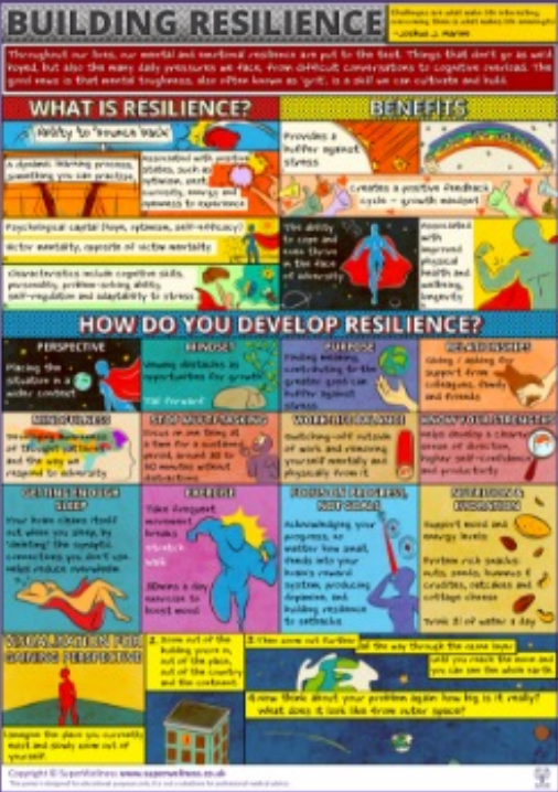 - Strategies to build resilience (such as building a sense of purpose, positive thinking, self-care practices)