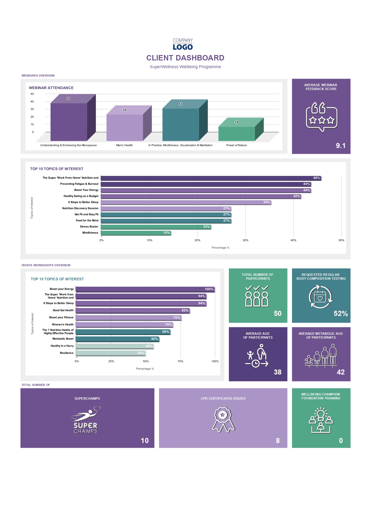 • Detailed overview of your SuperWellness programme, including key metrics and insights.